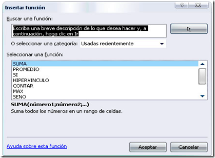 Tanto mediante la forma 2 como la 3, al elegir el nombre de la función y darle Aceptar, aparecerá el asistente para funciones